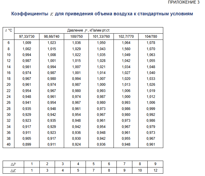 В соответствии с требованиями ГОСТ 12.1.005-76 объем воздуха, аспирированного при отборе проб, приводят к стандартным условиям: температуре 20 °С и барометрическому давлению 101,33 кПа (760 мм рт.ст.) по формуле;