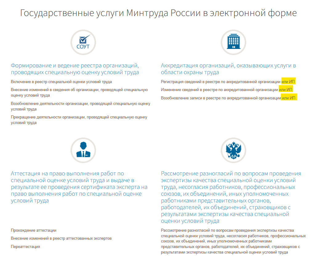 Есть такая услуга у Минтруда, как аккредитация ИП на оказание услуг в области охраны труда (не обучение!).