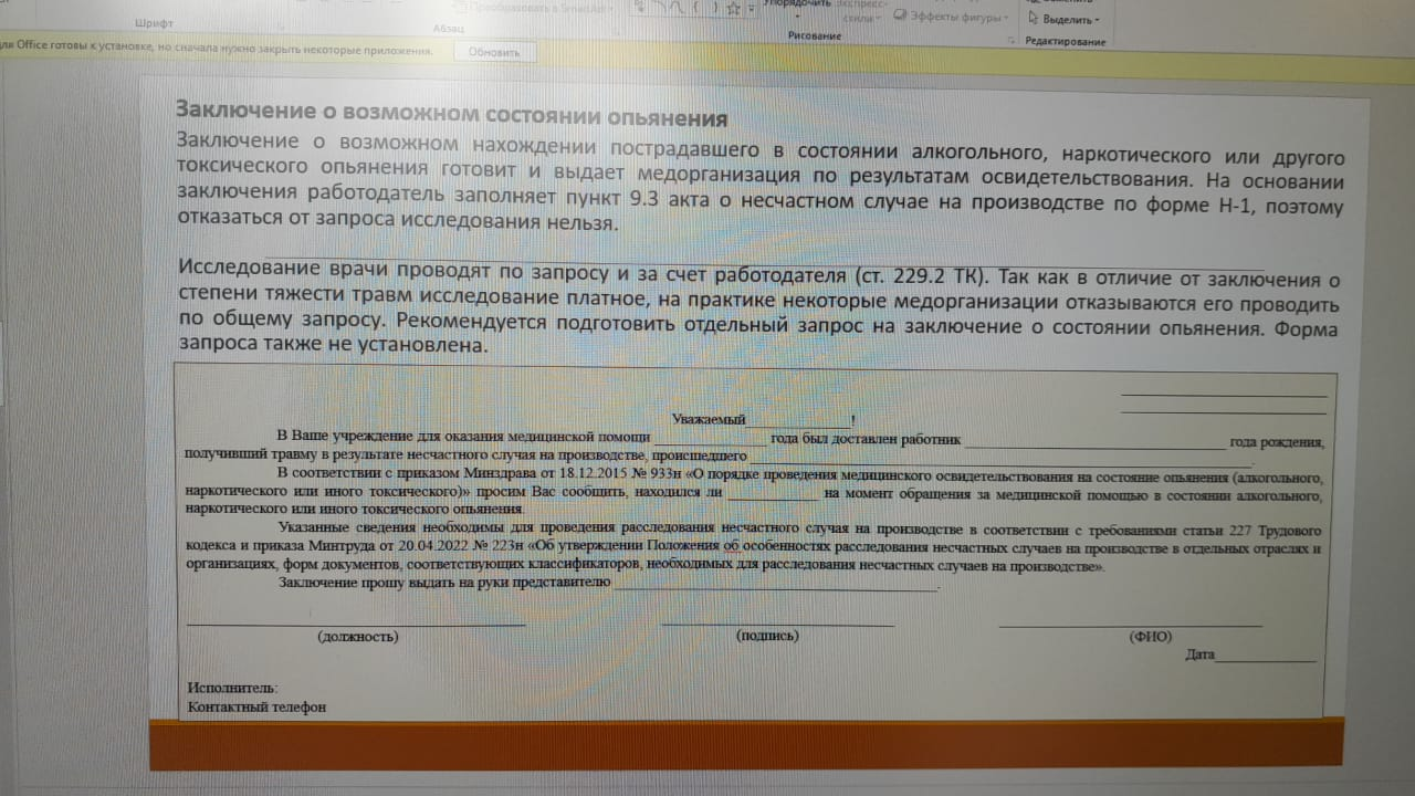 Добрый день. В московской области столкнулись с проблемой - Случилась травма на производстве. По скорой пострадавшего отвезли в больницу для оказания ему мед помощи. В эту же больницу сделали запрос на 315/у и в запросе дополнительно попросили дать справку на алкогольное состояние пострадавшего - для расследования НС.