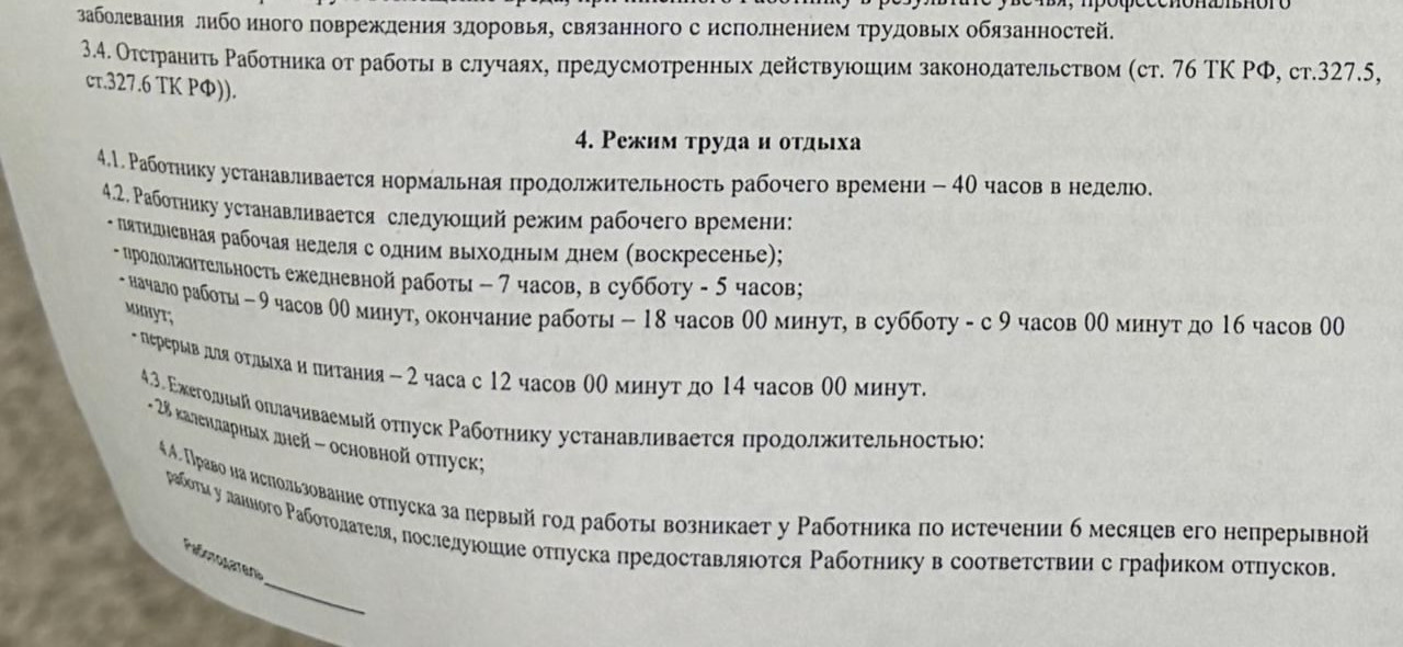 Только одно: В Договоре кадровички пишут: "ПЯТИДНЕВНАЯ рабочая неделя с ОДНИМ выходным"... В реалиях получается рабочая неделя ШЕСТИДНЕВНАЯ, раз один день выходной-воскресенье, согласно ст.111 ТК РФ.... Пятидневная рабочая неделя с одним выходным днём не предусмотрена, при пятидневной рабочей неделе работникам предоставляются два выходных дня в неделю, общим выходным днём является воскресенье.Второй выходной день устанавливается коллективным договором или правилами внутреннего трудового распорядка...... Кстати, нынешнее законодательство не запрещает введение 4-дневной рабочей недели. И кое-где уже переходят, правда, не от хорошей жизни......... Только, все равно Трудовой кодекс ограничивает ее максимальную продолжительность — не более 40 часов....... А насчет режима работы.... Раз работник Договор подписал, значит его всё устраивает. И обед в два часа - дом рядом.... Да и указывать у российского мужика (российской женщины) статьи 327.5 и 327.6 я бы не стал.......... А если работники состоят из одних гастарбайтеров, то они и не к такому режиму работы привыкли.....