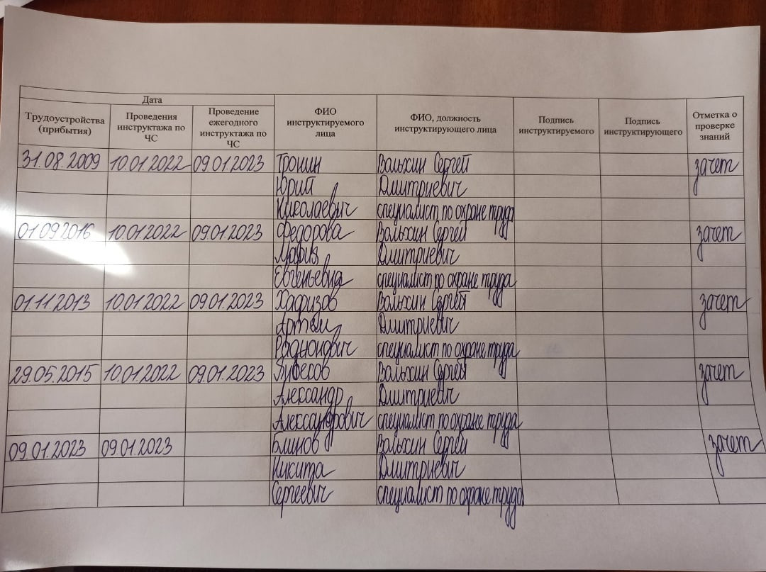 Добрый день. Поделитесь, пожалуйста примером заполнения журнала инструктажа по ЧС? Даже больше волнует как проводится ежегодный инструктаж, а не первичный. Есть графа: дата проведения ежегодного инструктажа. Туда просто вписывается дата очередного инструктажа. Или все записи делаются заново?