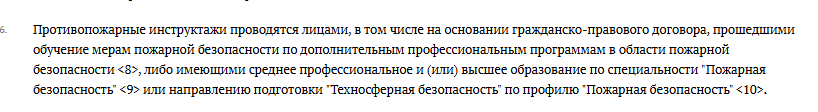 Лица, являющиеся ответственными за обеспечение пожарной безопасности на объектах защиты, в которых могут одновременно находиться 50 и более человек, объектах защиты, отнесенных к категориям повышенной взрывопожароопасности, взрывопожароопасности, пожароопасности, а также лица, на которых возложена трудовая функция по проведению противопожарного инструктажа, должны отвечать одному или совокупности следующих требований:
