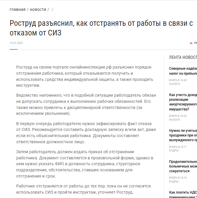 В Роструде считают, что, если работник отказывается получать СИЗ и не проходит инструктаж, работодатель обязан не допускать его к выполнению трудовых обязанностей. Предлагать другую работу работодатель в таком случае не обязан. При этом работника можно привлечь к дисциплинарной ответственности, за исключением увольнения. В своем ответе ведомство сослалось на ст. 21 Трудового кодекса, где сказано, что работник обязан соблюдать требования по охране труда и обеспечению его безопасности.