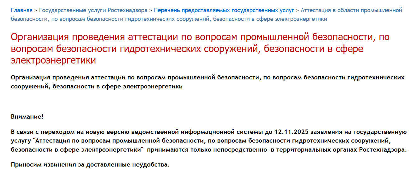 В связи с переходом на новую версию ведомственной информационной системы до 12.11.2025 заявления на государственную услугу "Аттестация по вопросам промышленной безопасности, по вопросам безопасности гидротехнических сооружений, безопасности в сфере электроэнергетики" принимаются только непосредственно в территориальных органах Ростехнадзора.