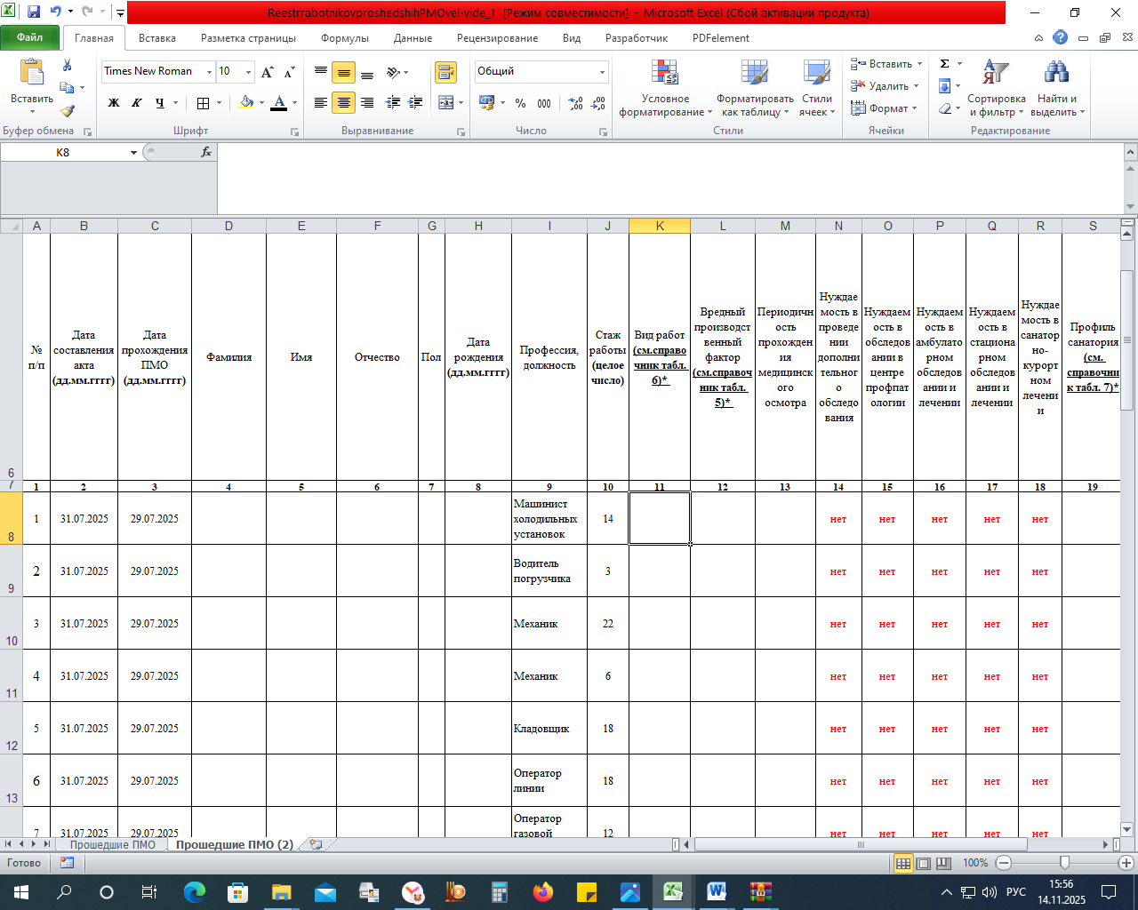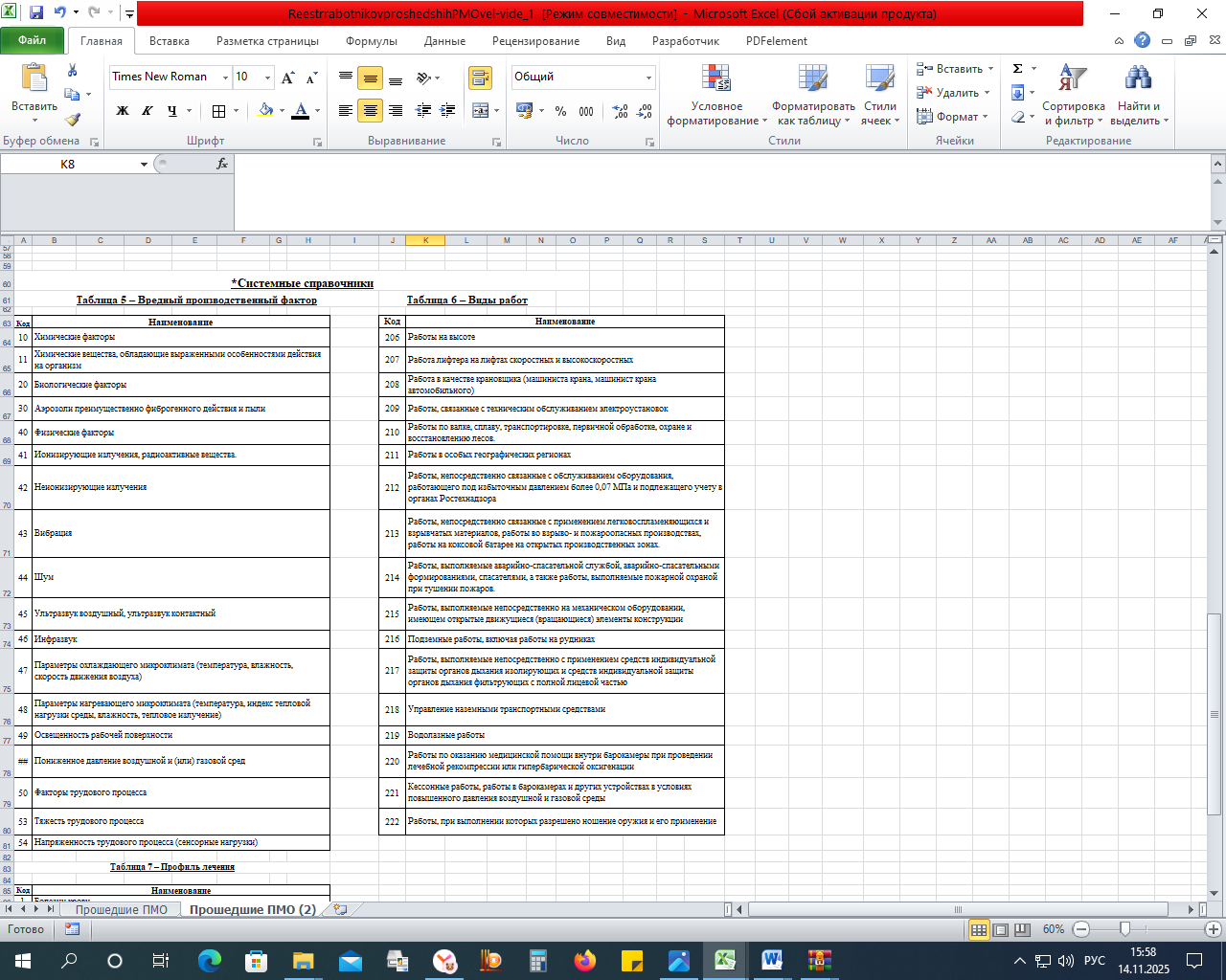 Коллеги, подскажите, пожалуйста, заполняю реестр прошедших ПМО. Там есть столбцы виды работ и вредный фактор.